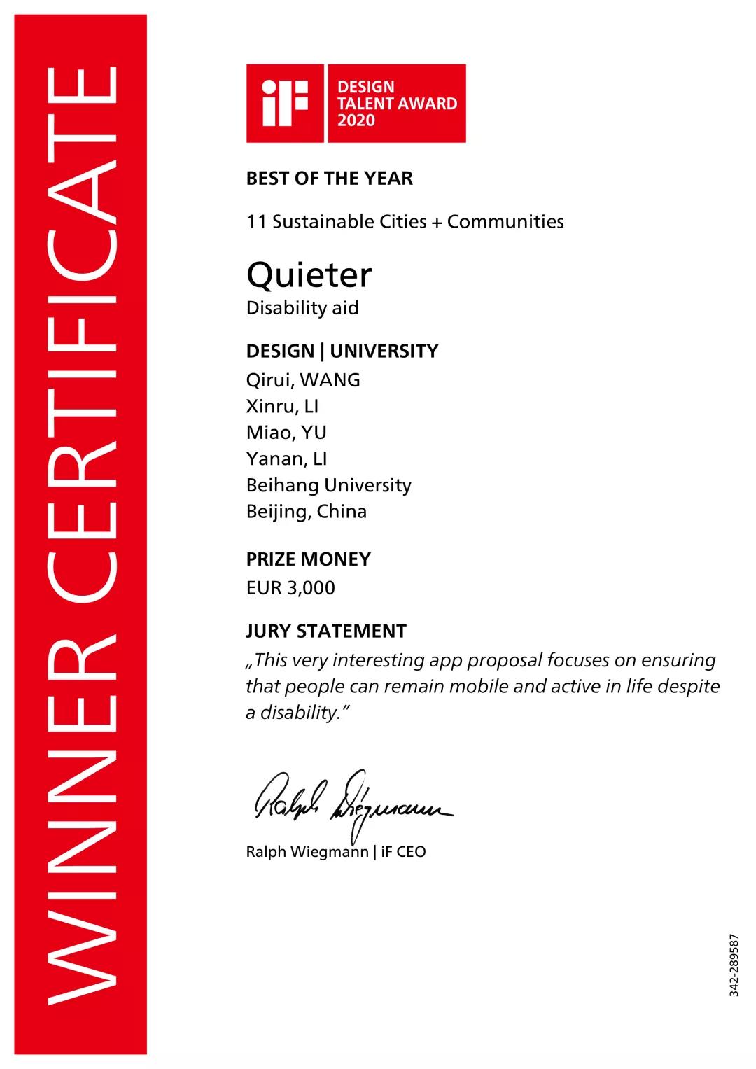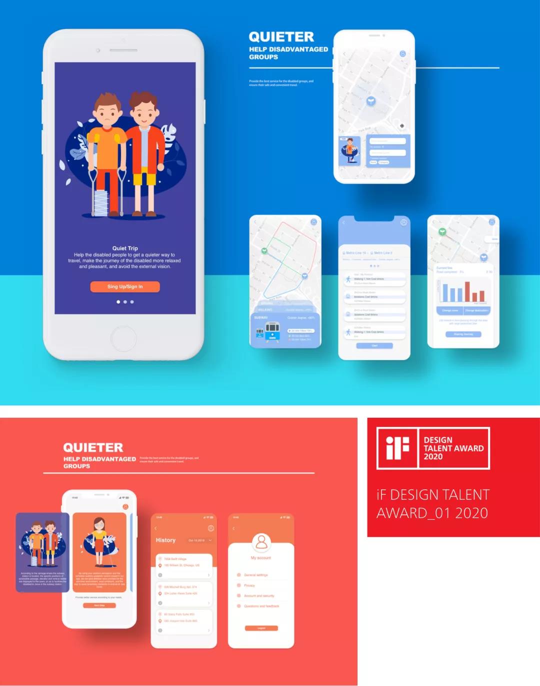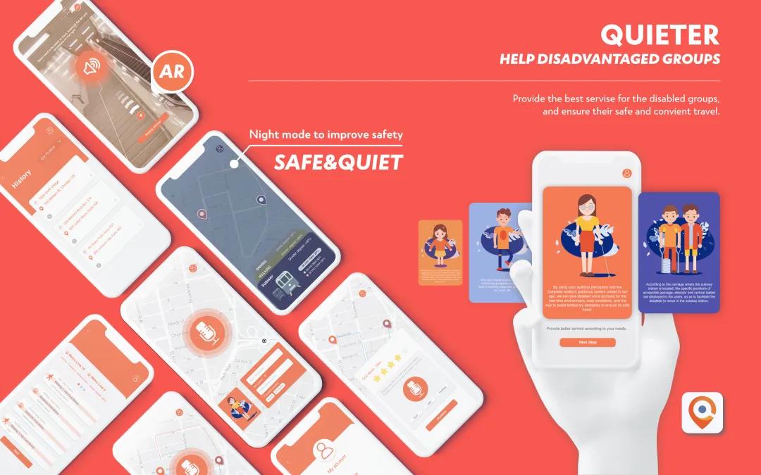 设计作品“Quieter”为其中的“可持续城市和社区(Sustainable cities and communities)”主题进行设计。该项目的目标是“到2030年,因公共交通系统的不断扩大,旨在为所有人(特别是弱势群体、妇女、儿童、残疾人和老年人)提供安全的、可支付的和可持续的交通系统方案,并改善道路安全。”该主题希望探讨设计在解决城市交通的可持续性和提高人类福祉中的相关价值。在全球超过一万件的设计参赛作品中,最终仅有7件作品荣获iF年度最佳奖(BEST OF THE YEAR)。我校4k影院 的本科生王麒瑞、栗歆茹、于淼、李亚男小组在众多参赛者中突出重围,斩获了年度最佳奖(BEST OF THE YEAR)并获得丰厚奖金。iF设计大赛(iF DESIGN AWARD)的评审团在其获奖评语中这样写道:“这个有趣的移动应用设计项目保证了残疾人在生活中的可移动的(mobile)能力和保持活动的(active)能力。”