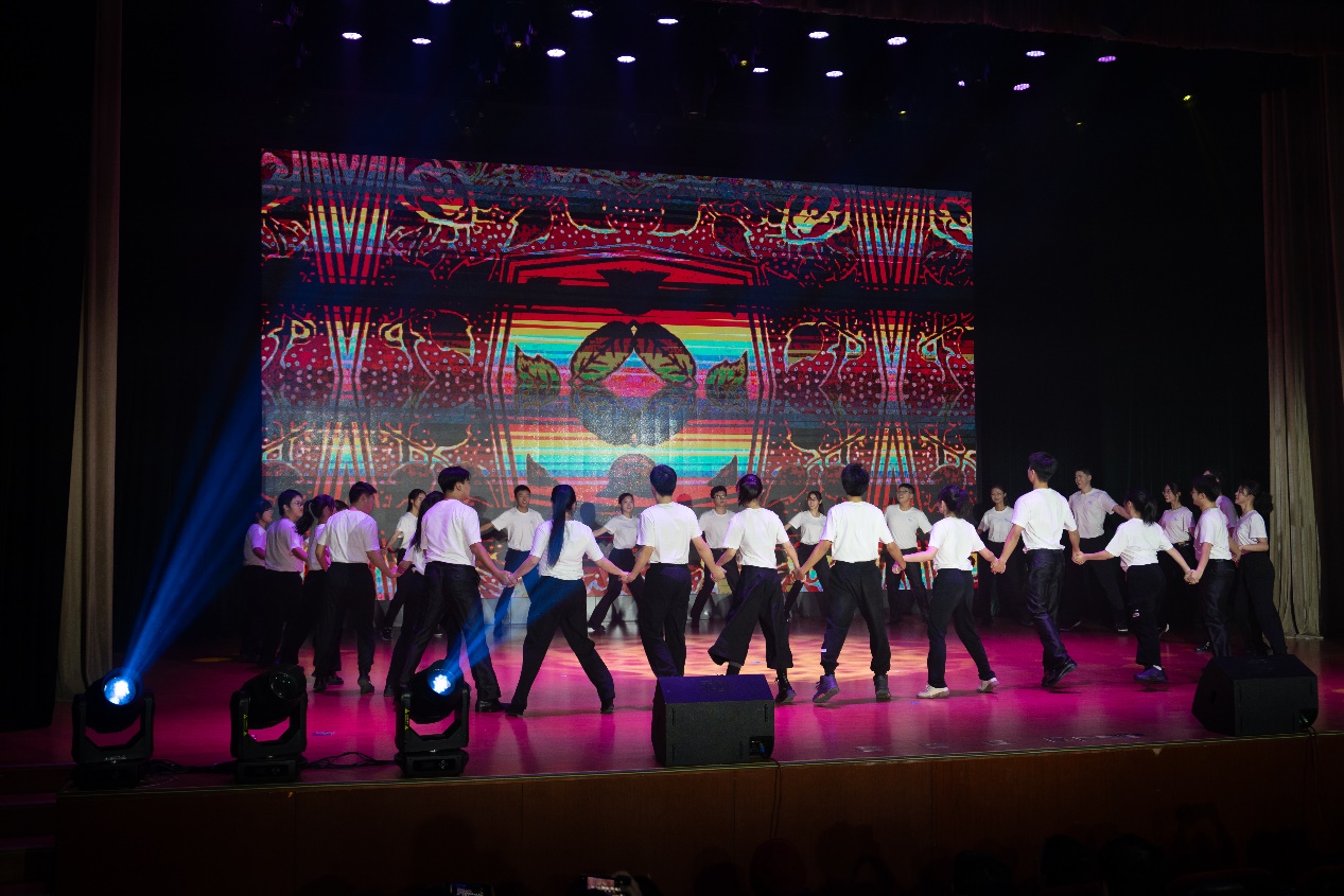音乐会开场舞是张璇老师开设的《中国民间舞蹈审美实践》课程教学展示群舞《东方红民族韵律操》,该舞蹈由汉族、藏族、佤族、傣族、蒙古族、维吾尔族、彝族、苗族八节组成,让同学们在感受民族文化的同时,提升文化自信心与包容感。