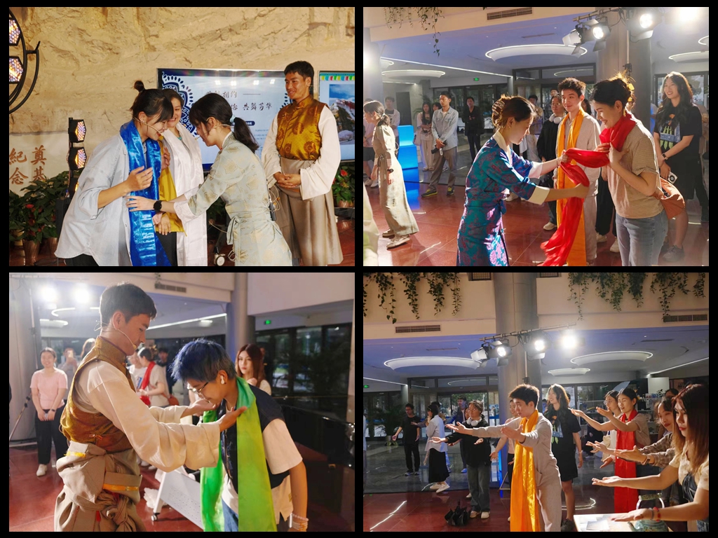 献哈达互动环节让大家近距离地感受藏族文化。几位藏族同学将蓝色、白色、红色、绿色、黄色的哈达一一献出,分别象征着藏族崇敬的天空、白云、火、水与土地。轻轻拂动的哈达飘带寄寓着最纯洁的祝福,美好的祝愿在人与人之间传递。