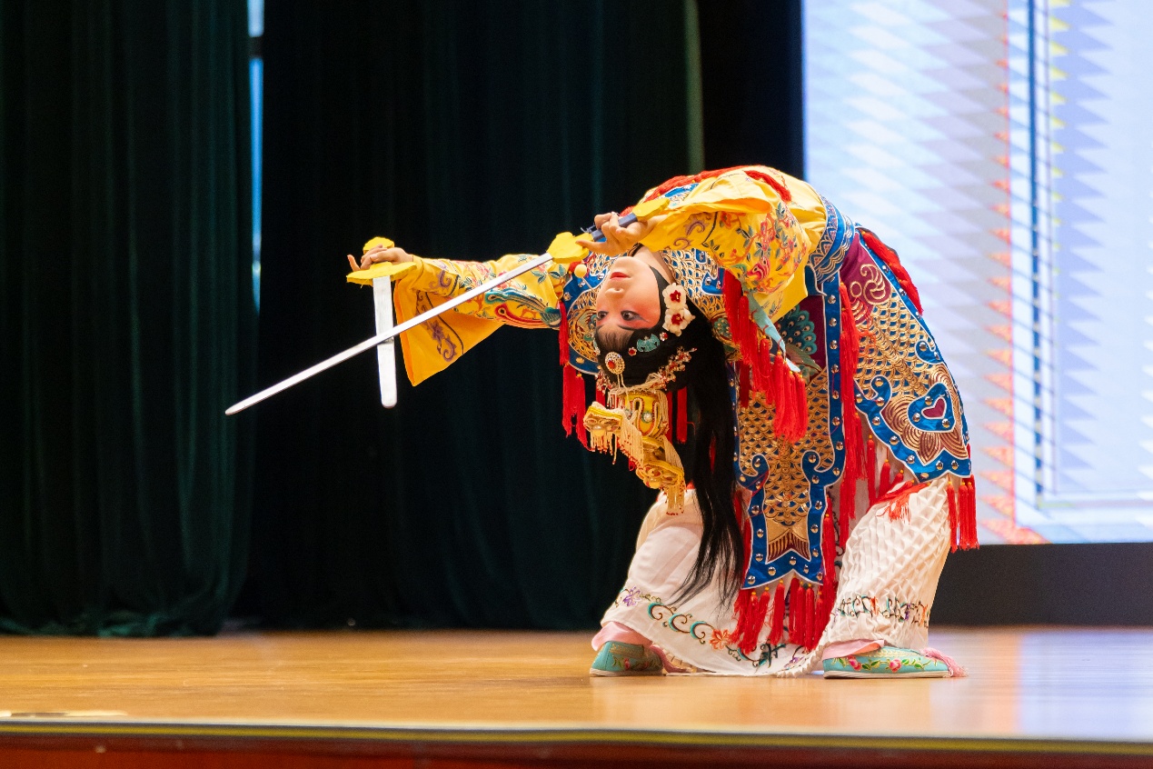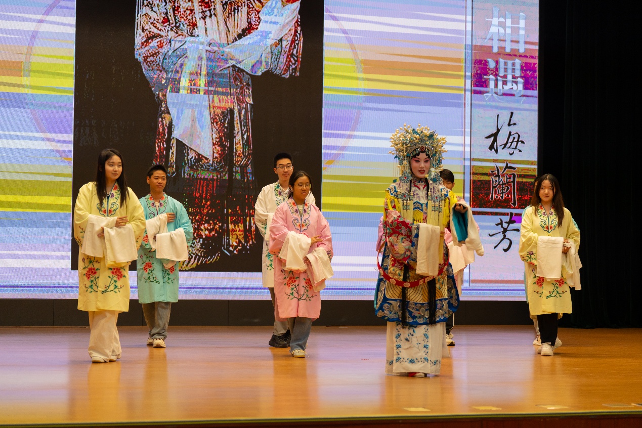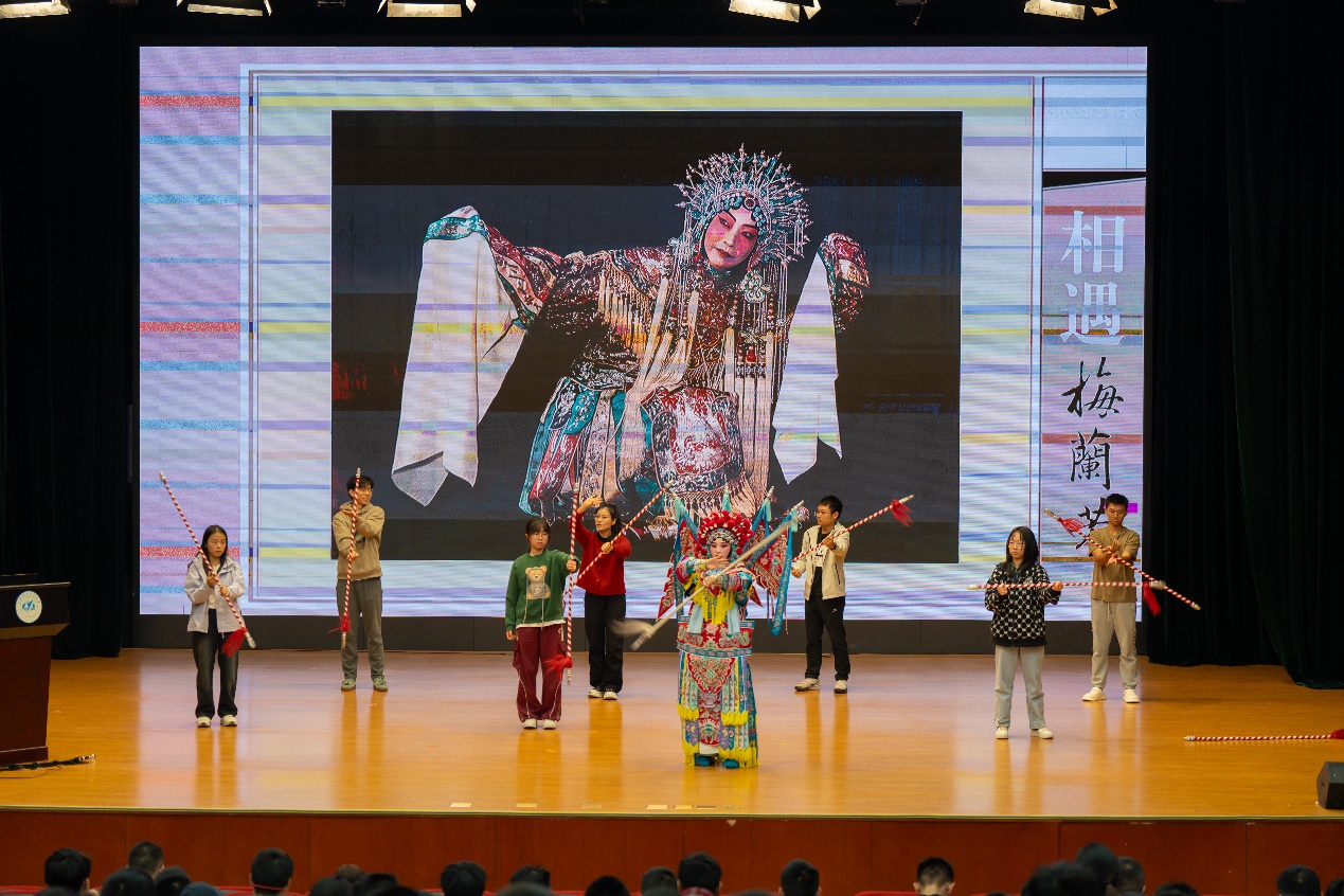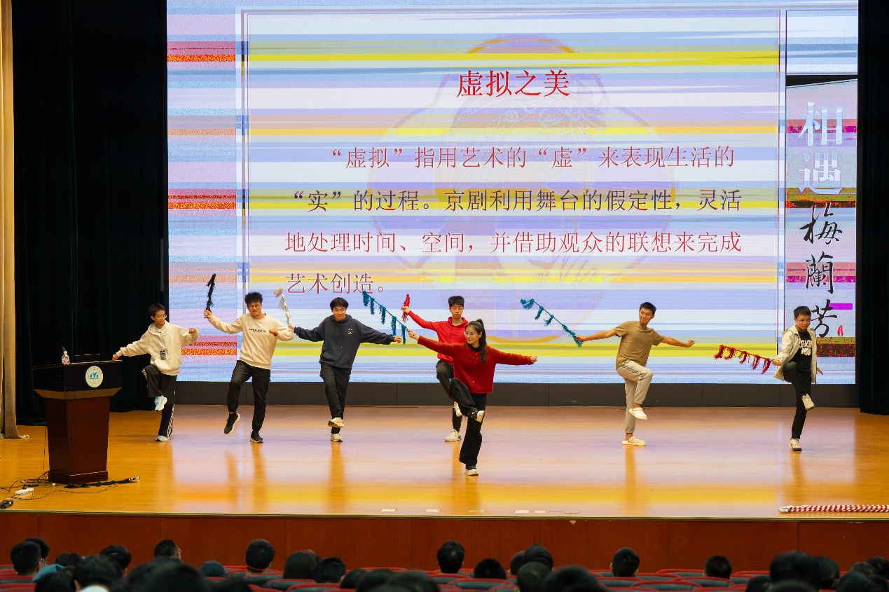 讲座采用讲演结合的形式,内容丰富多样,现场互动紧密。讲座一方面通过精彩的京剧片段演绎,带给同学们沉浸式的感受,另一方面在老师的现场指导教学下,同学们上台体验京剧,近距离感受京剧艺术的魅力。