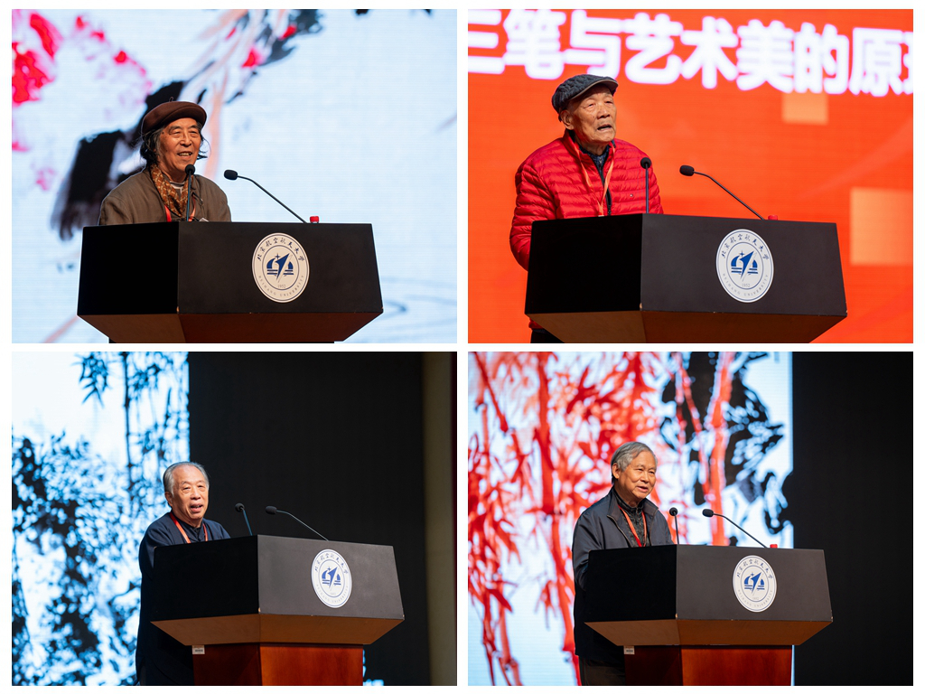 中国画学会创会常务理事、北京市文史馆馆员刘曦林以《世界文化背景下的中国美术断想》为主题,讲述了中国美术在全球文化背景下的重要性与它所面临的挑战和机遇,以及在世界文化背景下中华民族应有自己的独立思考与文化价值观。中央美术学院客座教授、清华大学中国画高研班齐辛民工作室导师、国家一级美术师齐辛民以《画中的三笔与艺术美的原理》为主题,基于画家的著作《画中的三笔》中的内容,讲解传统技法中不可缺少的构成形式,从而理解艺术美的原理,领悟艺术如何表现出美感的道理。北京画院艺术委员会委员、北京市高级职称评审委员、国家一级美术师郭石夫以《新时代的大写意之美》为主题,讲述了在中西文化和绘画观念的冲撞中,中国的大写意花鸟画要有新时代的“正大光明”气象。中国国家画院研究员、中国艺术研究院文学艺术院研究员汤立以《大道至简与中国的大写意艺术——兼论艺术与科学的关系》为题,讲述了艺术与科学的关系、大道至简与中国的大写意艺术、中西方艺术的比较及各自发展的路径、“全球化”背景下的文化自信四个方面内容。
