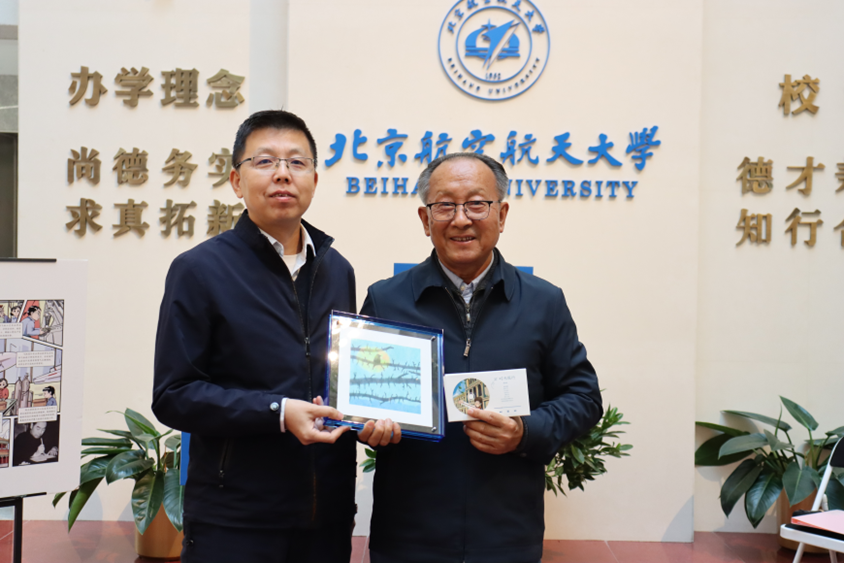 党委书记苗建军向中国老教授协会常务理事、北航老教授报告团常务副团长、《空天报国志》主编郑彦良赠送学生设计作品。参会人员欣赏手中出版的漫画书《画说空天报国志——我和“北京一号”轻型旅客机》,主持人介绍了该书的创作背景和过程。