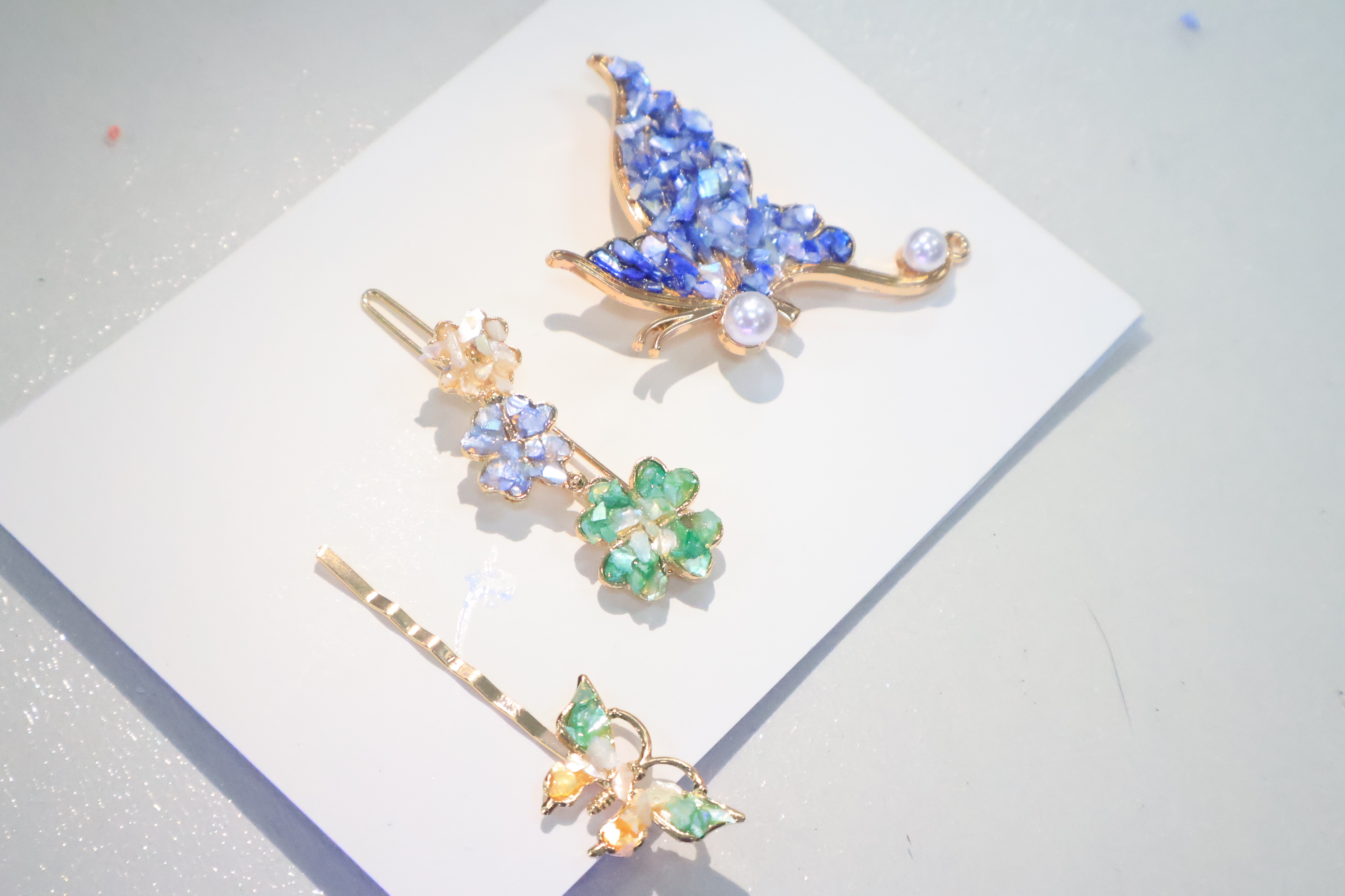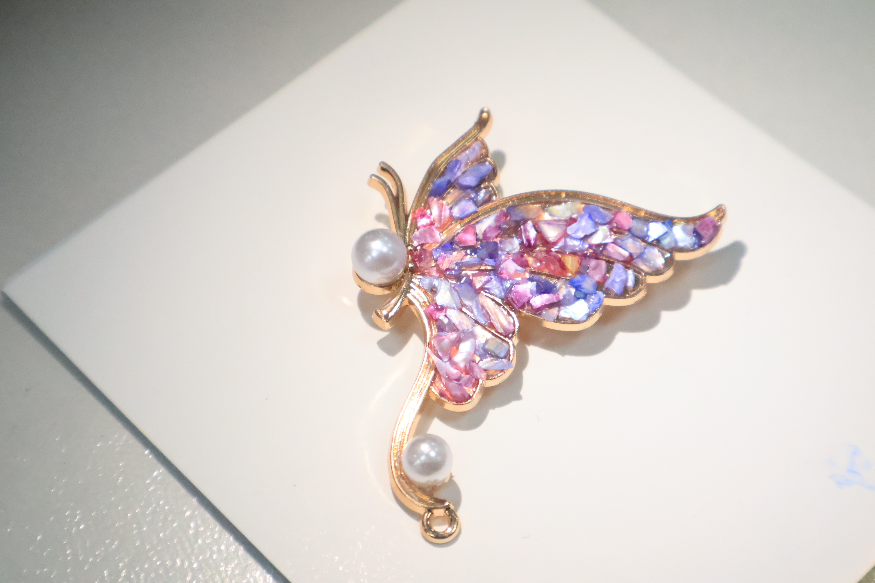 动手实践环节,老师们迅速投入创作。在新媒体学院老师与实践队队员的耐心指导与示范下,大家充分发挥创意,构思纹样、细致裁切贝壳片、精准定位粘贴,再经封层胶处理与紫外线灯固化,一步步完成专属螺钿胸针的制作。现场气氛热烈而融洽,工会会员们时而专注钻研,时而交流创作心得,彼此分享搭配技巧与粘贴经验。原本朴素的贝壳片,在一双双巧手下蜕变为独具个性的精美饰品,每一件作品都承载着创作者的巧思与温度。