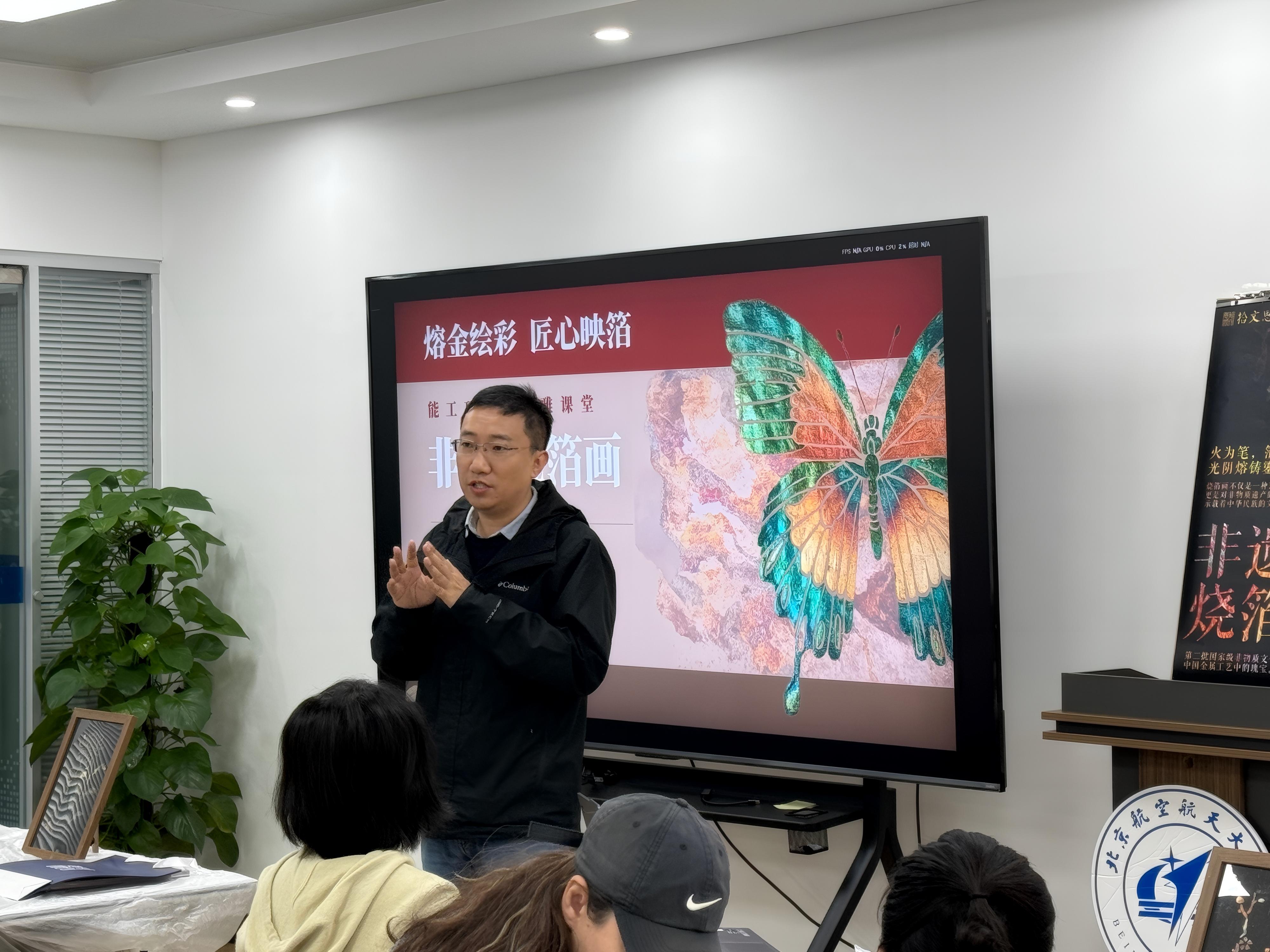 工会副主席孙振西担任指导老师。活动伊始,孙振西详细介绍了烧箔画的文化渊源与艺术价值。作为第二批国家级非物质文化遗产,烧箔画是中国金属工艺中的璀璨瑰宝,其核心技艺依托金属箔与硫磺等物质的加热化学反应,能呈现出变幻莫测的绚烂色彩,尽显中式美学的质朴与优雅。通俗生动的讲解让老师们快速了解了这项传统工艺的精髓,为后续创作奠定了良好基础。